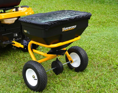 I bought this spreader for my landscaping business, and it’s been a reliable workhorse. The 125 lb. capacity is ideal for covering large areas, and it’s built to handle rough terrain. The only downside is the weight—it’s a bit heavy to move around when not towing. Overall, a great investment.
