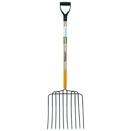 This Yardworks ensilage fork is designed for transferring manure, mulch, and other loose material. The 10-tine welded head is mounted to a hardwood handle with poly D-grip for strength and durability. This is a great tool for picking or cleaning up manure, hay, straw, or barley.